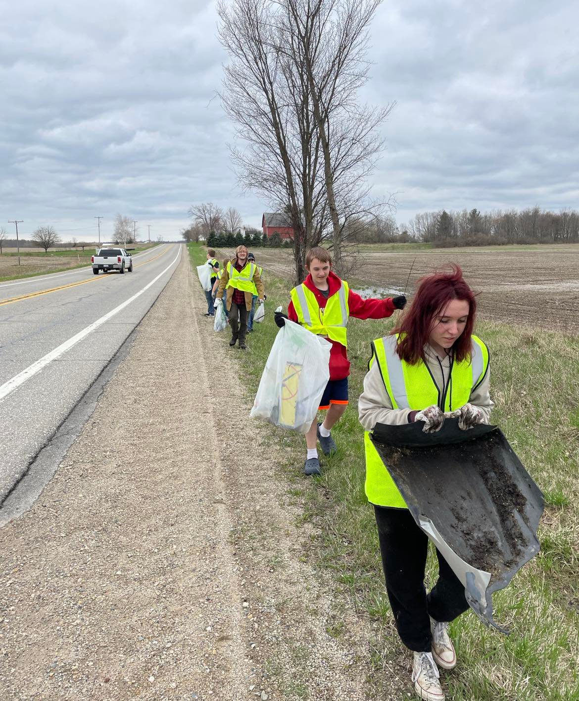 “Sunday afternoon, May 1, you may have noticed a lot of people in yellow vests in Lakeview on M-91 between Kendaville and Deaner roads. Three times a year Lakeview Lion’s Club cleans up that 2-mile stretch of road and this year 18 people answered the Club’s call to help. This year however, the added success was due to Zhanbolot, an exchange student from Kyrgyzstan. This exchange student is a scholarship recipient through the Department of State in their FLEX program and was instrumental in helping his Lion’s club advisor by taking inventory of what was needed for the clean-up and finding volunteers for the activity. He also gave the safety instructions before everyone headed out to the road. Altogether, three local Lions club members, four exchange students, and 11 high school and adult residents of Lakeview participated. Despite the fact that there was a lot of trash to pick up, many of the students found some interesting treasures. In all, 34 bags of trash were collected on the 2-mile stretch.